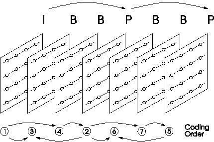 In this sequence, each set of two B frames depends on the preceding I frame and following P frame. As depicted in Figure 6.1, the fourth frame must be encoded before the second and third frames. This causes a small minimum delay time between when frames are received and when they are displayed. All of the P frames depend on the initial I frame. Each triplet can be encoded independently of following triplets. The sequence in its entirety can be encoded independently of the sets that precede it and follow it. At real time, this sequence would be repeated 1.5 to 2 times per second. One final note: the choice of sequence usually has a negligible effect on the performance of the decoder.